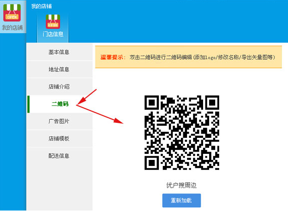點擊[我的店鋪]--二維碼,用你的微信掃一掃上面的優戶搜周邊二維碼。